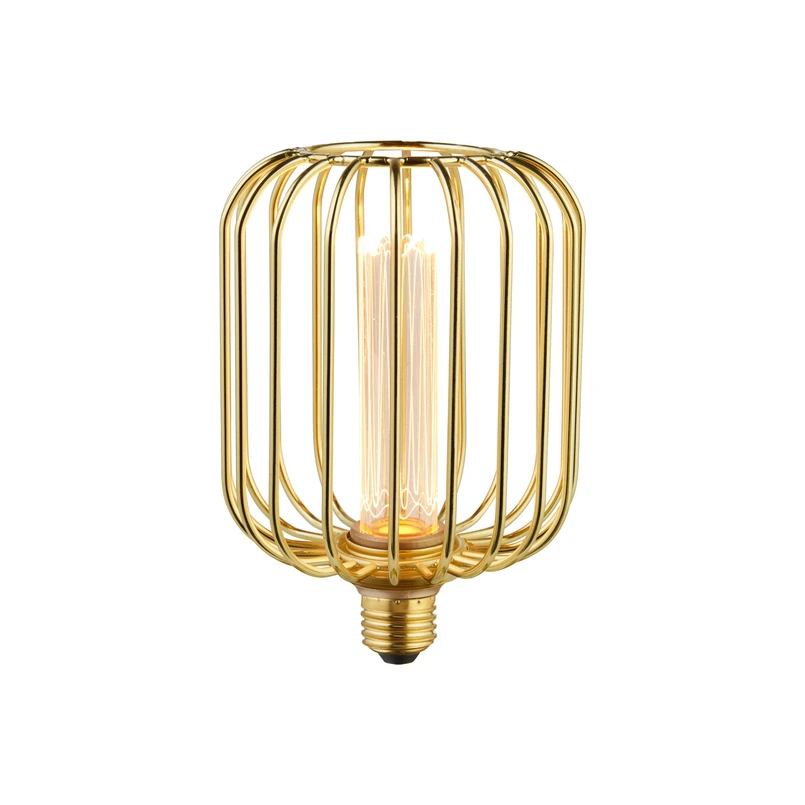 Ampoule LED Drum Filament avec culot E27, 3,5 watts, 1 800 kelvins, intensité variable L'ampoule LED Drum pour douilles E27 se présente avec une cage en acier laqué or. Les filaments à l'intérieur sont entourés de verre. Drum émet une lumière blanche chaude et son intensité est variable en externe.