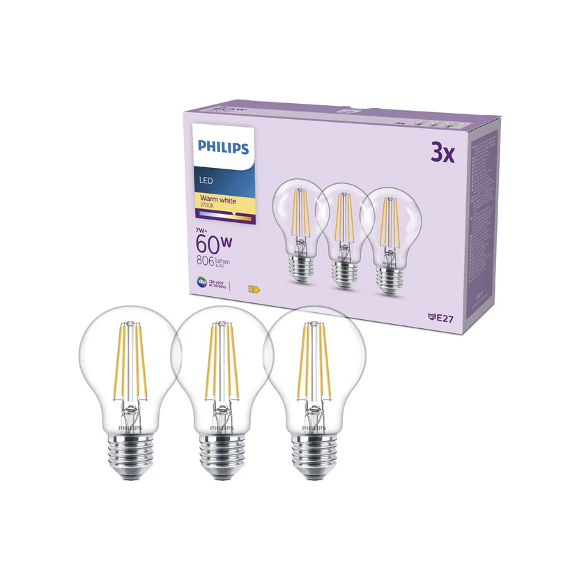 Ampoule LED Philips E27 A60 7W 806lm 2700K filament, lot de 3