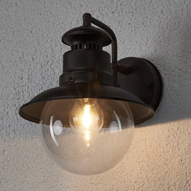 Applique d'extérieur d'aspect rustique Eddie avec cache en verre sphérique On ne peut pas ignorer la note rustique qui émane de l'applique d'extérieur Eddie. Elle est due à la forme spécifique dans laquelle elle a été conçue, mais aussi à la peinture couleur rouille de son support. Sous l'ampoule se trouve un cache de protection en verre transparent qui complète harmonieusement le design et qui, associé à la protection IP44, protège de la pénétration de la saleté et de l'eau. Une applique murale décorative pour l'extérieur qui offre toujours l'orientation nécessaire dans l'obscurité.