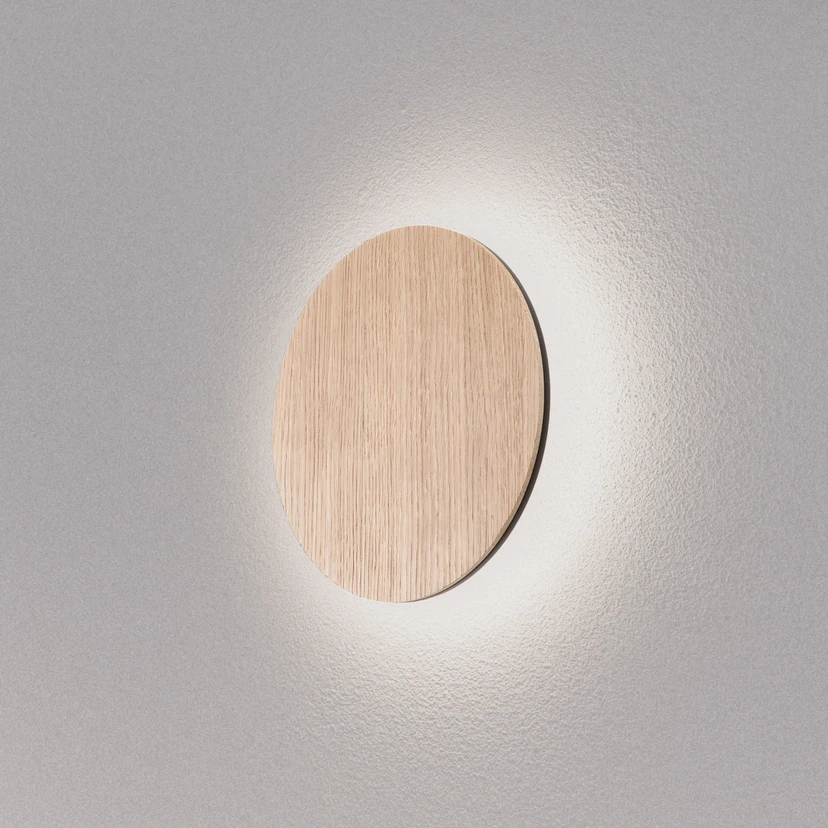 Applique murale LED Orios ronde avec cache en bois et émission de lumière indirecte L'applique murale LED Orios est conçue dans une forme circulaire et plate. La façade est entièrement occupée par un cache en bois clair. La source lumineuse LED est dissimulée derrière ce panneau. Sa lumière blanche chaude est diffusée tout autour, sur les côtés et sur le mur, de sorte qu'elle n'éblouit pas. La production a lieu en Europe.