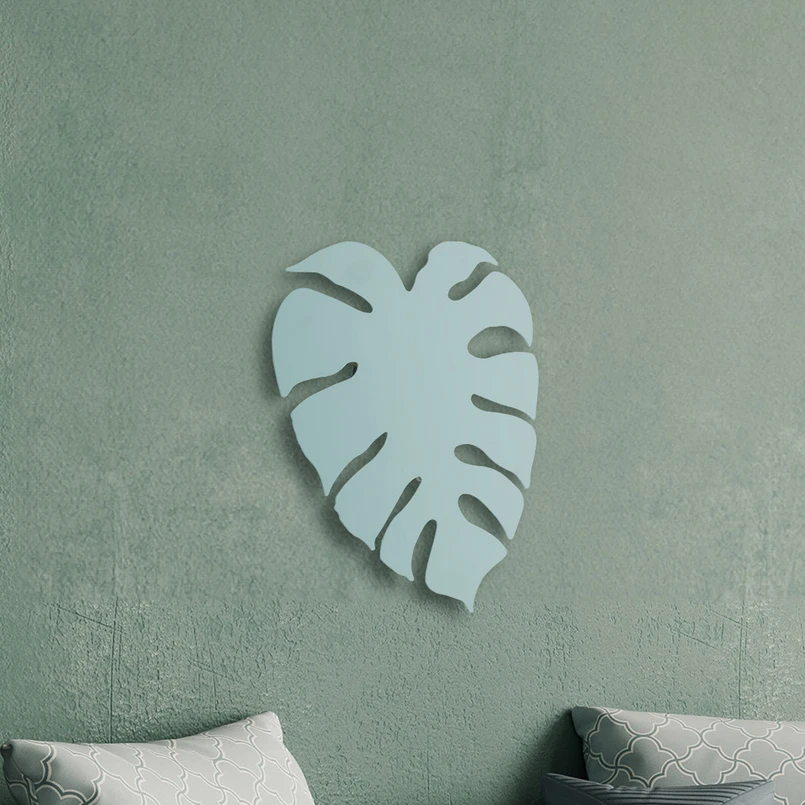 Applique murale Monstera à éclairage indirect, conçue comme une feuille L'applique murale Monstera, fabriquée en acier, est conçue comme la silhouette vert menthe d'une feuille de la plante d'intérieur très appréciée Monstera Deliciosa. Celle-ci est particulièrement mise en valeur lorsqu'elle fonctionne, car trois ampoules G9 à insérer à l'arrière éclairent la zone environnante du mur et font clairement ressortir la forme de la feuille.