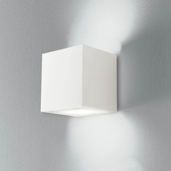 Applique murale Rubik en plâtre à peindre Lorsqu'on change la couleur d'une pièce ou d'une partie de l'aménagement, il arrive souvent que les lampes ne soient plus adaptées à la pièce. Pour résoudre ce problème, il existe une applique murale qui change simplement de couleur en fonction de la couleur des murs. Le plâtre dans lequel est fabriquée l'applique murale Rubik peut être facilement peint avec la couleur de mur souhaitée et s'adapte ainsi toujours sans problème à la pièce. À l'intérieur se trouve une douille G9 qui éclaire vers le haut et vers le bas lorsqu'on utilise une ampoule adaptée.
