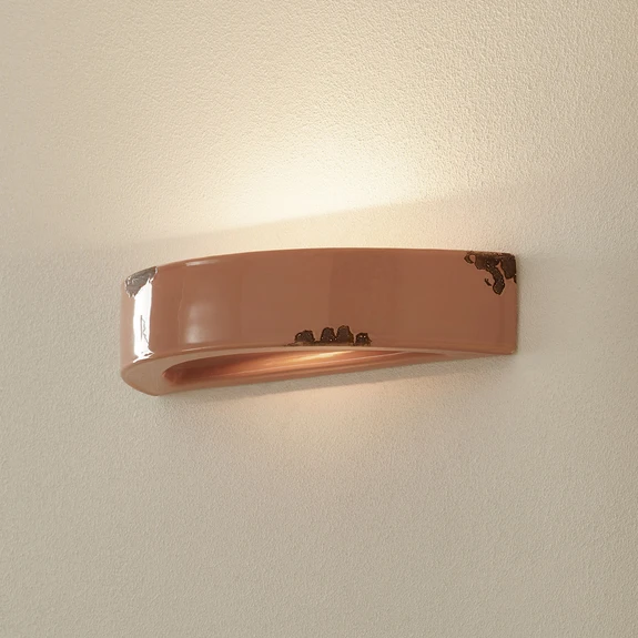 Applique murale en céramique C603 au look vieilli L'applique murale C603 fabriquée en Italie doit son charme vintage à sa peinture spéciale. Celle-ci est appliquée de manière incomplète à certains endroits, ce qui donne l'impression que le temps a laissé ses traces sur la lampe. En raison de sa fabrication artisanale, chaque exemplaire est unique. Le corps de l'applique, qui s'étend dans la pièce, est en céramique. Sur les côtés supérieur et inférieur se trouvent des ouvertures recouvertes de verre qui permettent à la lumière de la lampe R7s de se répandre sur le mur comme un Akzent Up&Down - fabriqué à la main en Italie
