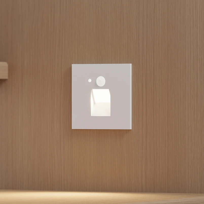 Luminaire encastrable LED blanc Neru au design angulaire avec détecteur de mouvement Une cage d'escalier accueillante a besoin d'un éclairage attrayant pour être parfaitement mise en valeur, même dans l'obscurité. La lampe encastrable LED Neru peut fournir l'éclairage nécessaire et possède un aspect sobre qui apporte une touche discrète aux murs de l'appartement. Le corps du luminaire est en aluminium et d'un blanc harmonieux. Après l'installation, il ne reste du luminaire encastrable LED qu'un carré fin à la surface du mur. Les LED fixes génèrent un éclairage blanc chaud et le détecteur de mouvement confère au luminaire une certaine utilité.