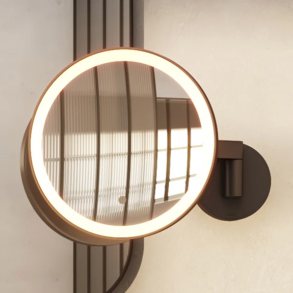 Miroir cosmétique pivotant et inclinable Nagoya pour la salle de bains Grâce à son design sobre, le miroir cosmétique Nagoya s'intègre sans problème dans chaque salle de bains et s'harmonise avec chaque intérieur. Nagoya n'est pas seulement un miroir grossissant, mais aussi une source de lumière qui peut être utilisée dans la salle de bains comme éclairage fonctionnel sans ombres. Le bras réglable permet de tourner et d'incliner le miroir afin d'ajuster à tout moment l'éclairage du miroir selon les besoins. De plus, il est équipé d'un capteur d'ondes qui permet de l'activer les mains libres - grossissement 5 fois