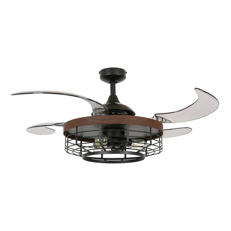 Ventilateur de plafond noir Fanaway Montclair avec pales transparentes escamotables et luminaire LED Le ventilateur de plafond Fanaway Montclair à quatre pales avec éclairage LED présente un look de cage très tendance. Les pales transparentes en acrylique peuvent être facilement repliées lorsque la fonction de ventilation n'est pas utilisée. Ampoule LED avec culot E27 et télécommande incluses. Fonctions Le ventilateur de plafond Fanaway Montclair assure non seulement une circulation efficace de l'air, mais aussi, grâce à son abat-jour en forme de cage, un éclairage LED à faible consommation d'énergie qui rayonne de tous les côtés. Le réglage des différentes vitesses peut s'effectuer au choix à l'aide de l'interrupteur intégré au boîtier du moteur ou de la télécommande fournie. Fanaway Montclair peut être installé sur des plafonds dont l'inclinaison peut atteindre 15° et est livré avec une rallonge.