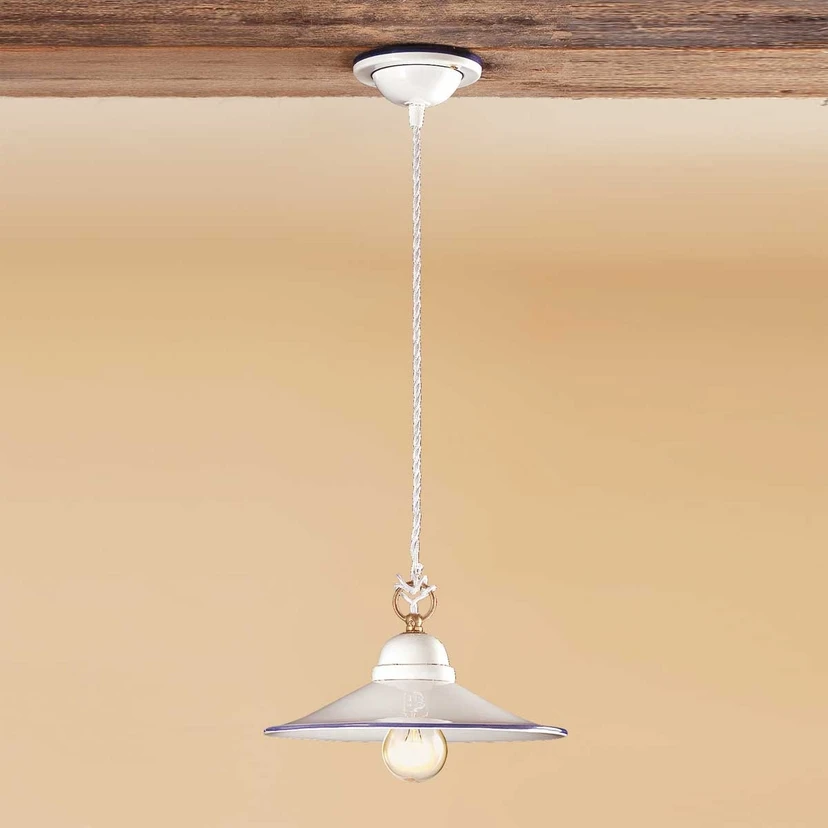 Lampe à suspendre PIATTO en céramiqueLa lampe à suspendre PIATTO est l'objet d'éclairage parfait pour la cuisine ou la salle à manger de style campagnard. Un abat-jour plat en céramique, émaillé blanc, est un point de mire décoratif au-dessus de la table. La lumière est diffusée vers le bas. Le bord bleu de l'abat-jour est un détail décoratif.