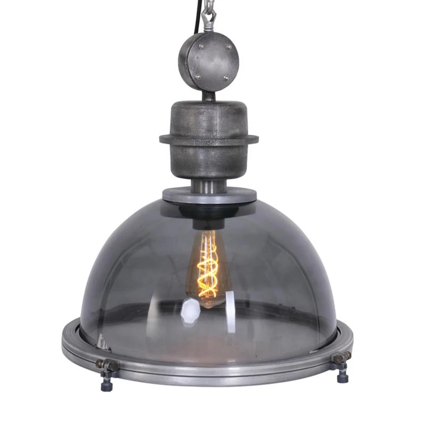 Lampe à suspendre insolite Bikkel avec abat-jour en verre gris transparentLa lampe à suspendre Bikkel attire l'attention par son design industriel. La suspension à elle seule est déjà très unique et difficilement comparable à d'autres luminaires. L'abat-jour transparent a une forme semi-circulaire ouverte vers le bas. Il est en verre foncé et est recouvert dans sa partie inférieure par un diffuseur satiné fixé par trois pinces. L'ensemble donne un style rustique et industriel qui fait de la suspension Bikkel une pièce d'ameublement hautement décorative. Elle peut ainsi être utilisée comme accroche-regard dans la cuisine, tout comme au-dessus d'une table de salle à manger luxuriante, et répandre son charme rustique. Le diffuseur crée un éclairage généreux et non éblouissant, adapté à toutes les situations de la vie quotidienne.