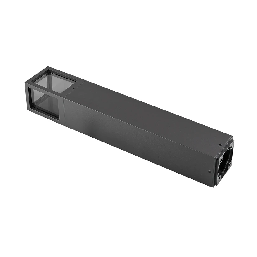 Borne lumineuse Facado II de forme cubique en métal gris foncé avec cache gris fumé