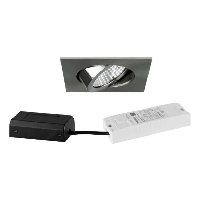 Downlight encastré à LED BB05, avec driver à gradation DALI et boîtier de raccordement Le downlight encastré à LED carré BB05 est livré complet avec un driver LED à gradation DALI et un boîtier de raccordement. Le spot peut être orienté de 30° sur tout le pourtour afin d'orienter le faisceau lumineux de manière ciblée. Le montage encastré dans des plafonds d'une épaisseur maximale de 1,3 cm s'effectue sans outil grâce aux ressorts d'encastrement - réflecteur argenté avec répartition de l'intensité lumineuse à symétrie de révolution et à distribution profonde et extensive - cache en polycarbonate transparent pour une répartition optimale de la lumière - appareillage électronique inclus, dimmable DALI-2 - aucun cache avec matériau d'isolation thermique