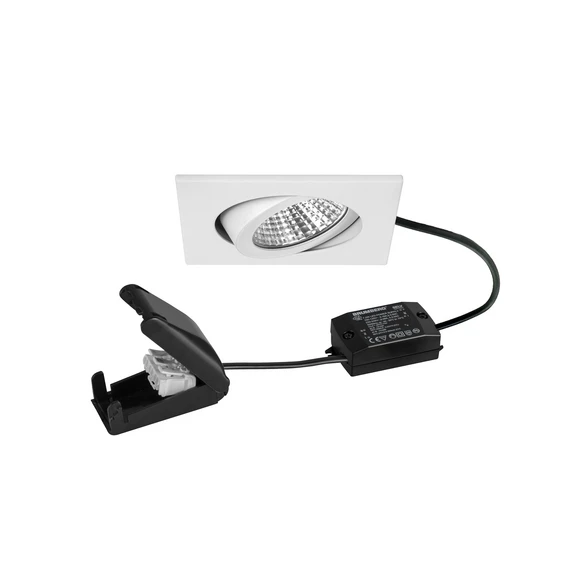 Spot encastrable LED angulaire BB05, orientable, avec boîtier de raccordement et driver LED Le spot encastrable LED BB05 a été fabriqué en aluminium et est équipé de LED éclairant en blanc chaud. Celles-ci sont placées dans une tête de lampe mobile de tous les côtés, ce qui permet d'orienter la lumière en fonction des besoins. Équipée d'un réflecteur argenté avec une répartition de l'intensité lumineuse à symétrie de révolution, profonde et large, et d'un cache transparent en polycarbonate, la lumière est diffusée avec une répartition optimale. Ce spot encastré sobre s'harmonise avec les concepts d'aménagement modernes et constitue le downlight idéal pour les espaces commerciaux et privés, au-dessus du coin cuisine, dans le couloir ou dans le salon. Grâce aux ressorts d'encastrement, le spot encastrable peut être monté sans outils. Il est équipé d'un boîtier de raccordement - convertisseur LED non variable inclus - angle de rayonnement : 38° - zone de pivotement : 30° tout autour - ne doit pas être recouvert de matériau d'isolation thermique