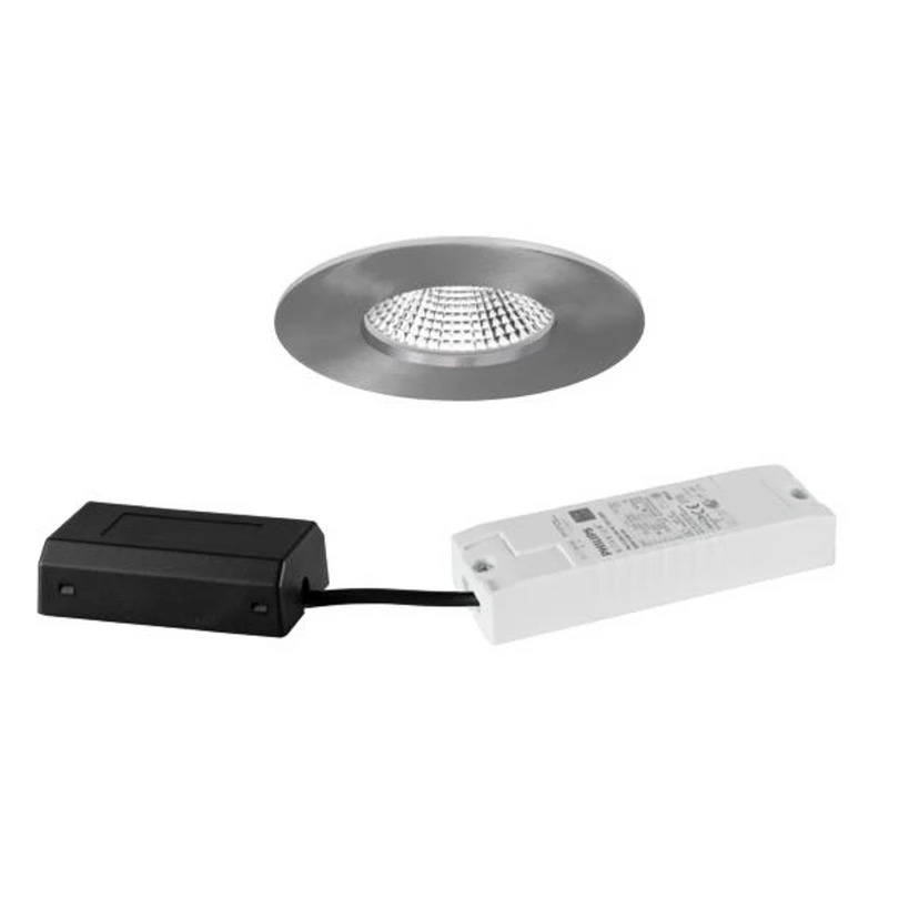 Downlight encastré à LED BB20 dimmable DALI et boîtier de connexion, IP65 Le downlight encastré à LED BB20 est livré avec un pilote LED dimmable DALI et un boîtier de connexion à 5 pôles pour le câblage traversant. Avec un indice de protection IP65, il est étanche à la poussière et protégé contre les jets d'eau, ce qui le rend parfait pour éclairer les zones de bien-être ou autres zones humides dans le secteur commercial. La lumière blanc chaud des LED intégrées est diffusée de manière optimale dans un angle de rayonnement de 36° par le réflecteur argenté avec une répartition de l'intensité lumineuse à symétrie de révolution et un cache transparent en plastique. Grâce à l'équipement en ressorts d'encastrement, le spot encastré peut être monté sans outils. Il peut être encastré dans des plafonds d'une épaisseur maximale de 1,7 cm - appareillage électronique inclus, gradable DALI-2 - température ambiante admissible - 20 à 25 °C - ne doit pas être recouvert d'un matériau d'isolation thermique - indice de protection élevé IP65