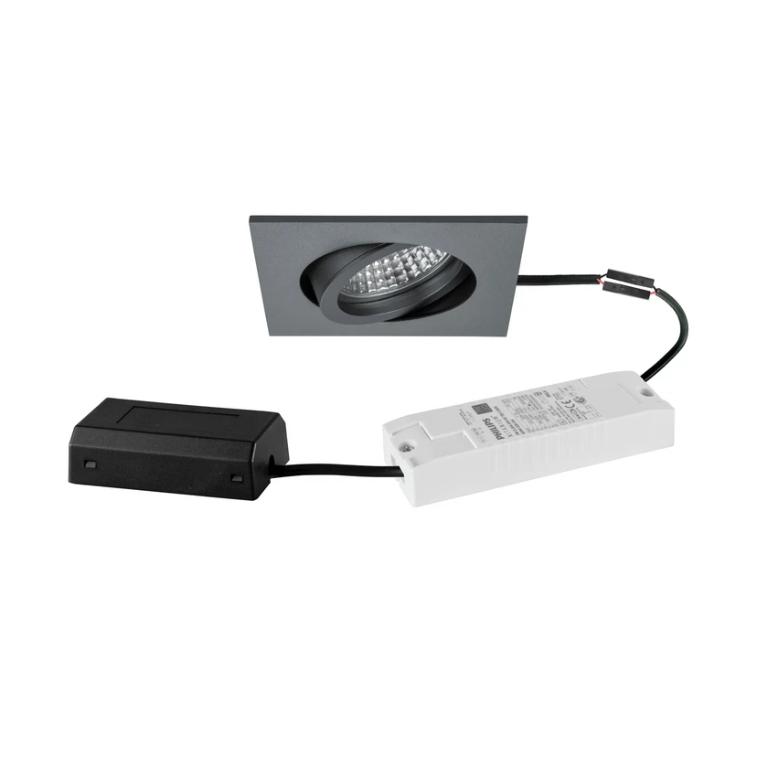 Spot encastrable LED Tirrel-S avec ballast à intensité variable DALI et boîtier de raccordement Tirrel S est un spot encastrable LED de forme carrée, livré en kit avec un ballast électronique à intensité variable DALI et un boîtier de raccordement. Le spot pour plafond peut être monté sans outil dans les plafonds à l'aide de ressorts d'encastrement et la tête de la lampe peut être orientée de 20° dans le boîtier afin de diriger l'éclairage. L'équipement d'un réflecteur argenté brillant avec une répartition de l'intensité lumineuse à symétrie de révolution basse-large et le cache en verre transparent garantissent une répartition optimale de la lumière et un rendement lumineux élevé. - température ambiante admissible (ta) : -20 °C - +25 °C - classe de protection (EN 61140) : II, protection IP (DIN EN 60529) : IP20 - avec ballast électronique, gradable DALI-2 - avec boîtier de raccordement - sans jonc d'arrêt visible
