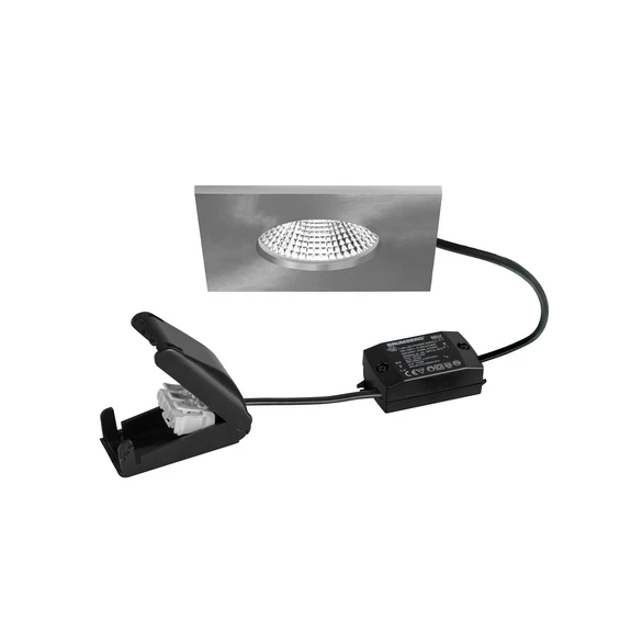 Spot encastrable LED BB21 IP65 avec driver LED commutable et boîtier de raccordement Le spot encastrable LED BB21 de forme angulaire peut être installé dans les salles de bains, les espaces bien-être, etc. grâce à son équipement de protection IP65. Grâce à des ressorts d'encastrement, le downlight se monte sans outil, peut être encastré dans des plafonds d'une épaisseur maximale de 1,7 cm et n'est pas dimmable. Dans un angle de 36°, il diffuse un éclairage blanc chaud, qui est réparti de manière optimale par le réflecteur argenté avec une répartition de l'intensité lumineuse à symétrie de révolution, profonde et large, à travers le cache transparent en plastique.