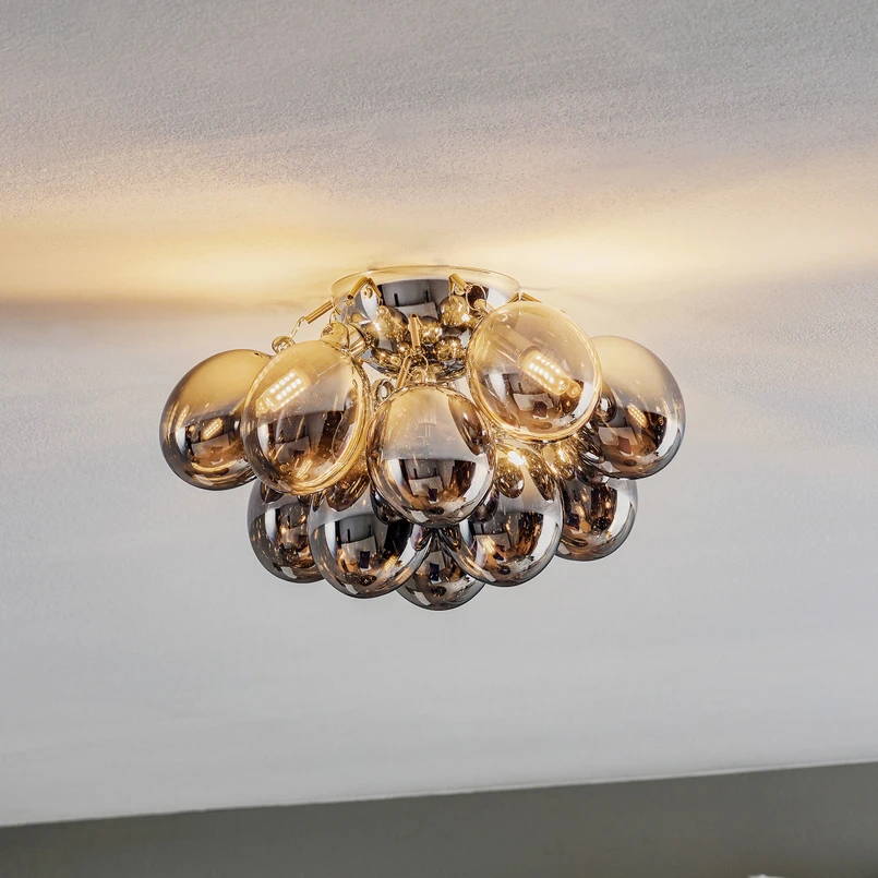 Les 12 sphères délicates en verre gris fumée sont maintenues par une fixation au plafond en métal brillant et semi-sphérique. L’éclairage particulier de ce luminaire est créé par trois ampoules G9, utilisés dans la fixation au plafond et qui illuminent les sphères en verre par le haut. Le plafonnier Gross attire l’attention dans toutes les pièces.