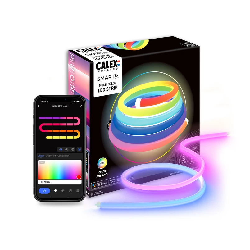 Mince & Atmosphérique : tube lumineux LED intelligent Neon 360 Tube, directement contrôlable par WLAN Éclairez votre pièce avec le tube lumineux LED Smart Neon 360 Tube de Calex. Grâce à la technologie RGBIC (lumière colorée réglable de manière dynamique), il offre une expérience d'éclairage vivante et polyvalente. Grâce à la protection IP44, le Neon 360 Tube est protégé contre les projections d'eau et convient parfaitement pour l'extérieur. De plus, ce produit phare intelligent est facile à installer via Plug & Play : Le kit est livré avec un câble de raccordement et une fiche de 1,5 mètre de long, ce qui vous permet de vous lancer immédiatement. Tout ce que vous avez à faire est de déballer le kit, de brancher la fiche dans la prise et de l'associer à l'application Calex Smart. Pas besoin d'installateur, il suffit de brancher & Play ! Ensuite, vous pouvez facilement contrôler l'éclairage directement via WLAN avec l'application gratuite Calex, même si vous n'êtes pas chez vous. Un pont ou une passerelle ne sont pas nécessaires. Grâce à l'application gratuite et conviviale Calex Smart App, vous pouvez contrôler votre éclairage depuis n'importe quel endroit. Définissez des minuteries et des horaires adaptés à votre emploi du temps et utilisez des scénarios prédéfinis pour adapter l'éclairage à vos besoins. Vous avez plusieurs articles Calex Smart chez vous ? Reliez-les en groupes pour un maximum de confort et un contrôle unifié. Le Calex Smart Neon 360 Tube peut également être contrôlé par commande vocale - c'est possible avec Google Home Assistant, Amazon Alexa et Siri Shortcuts. Que vous souhaitiez éclairer votre salon, créer une ambiance sur votre terrasse ou donner une dimension supplémentaire à votre jardin, le Smart Neon 360 Tube est le choix idéal. Le tube LED flexible peut être placé à votre guise et offre de nombreuses possibilités de personnaliser votre espace. Caractéristiques techniques / compatibilité : - tube RGBIC de 3 mètres de long, y compris câble de raccordement et fiche de 1,5 mètre - installation Plug & Play facile - contrôle par WLAN directement via l'application Calex sans passerelle / pont supplémentaire - intensité variable par application et réglage dynamique en millions de couleurs - commande vocale possible via Google Home, Alexa et Siri - convient pour l'intérieur et l'extérieur (IP44)