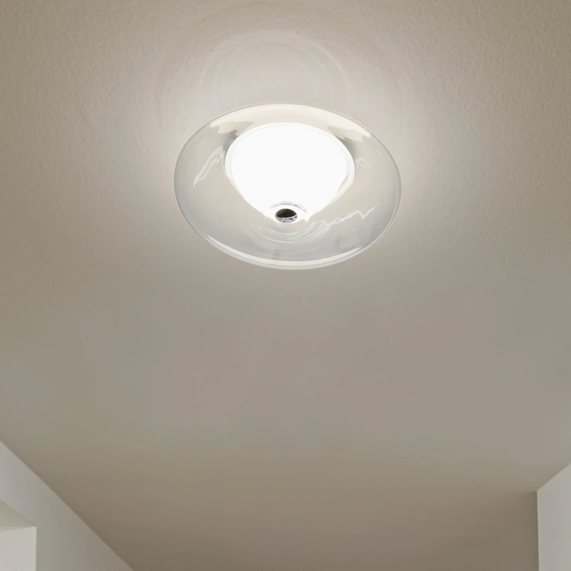 Plafonnier LED Bloo avec abat-jour en verre soufflé à la bouche La symbiose harmonieuse entre le verre cristal transparent et le verre opale blanc du plafonnier Bloo produit une lumière claire mais douce et sans éblouissement. Les deux verres sont soufflés à la bouche et sont d'une qualité extrêmement élevée au toucher et à l'œil. L'armature est fabriquée en aluminium et revêtue de poudre blanche mate. Le cache en aluminium tourné CNC, visible par le bas, est poli à la main pour lui donner un aspect brillant et s'harmonise parfaitement avec le verre en cristal. À l'intérieur, derrière la demi-sphère en verre opale blanc, se trouve une LED puissante qui peut être remplacée. L'intensité lumineuse du plafonnier peut être réglée à l'aide d'un variateur LED approprié, par exemple un variateur LED de la marque VADSBO.