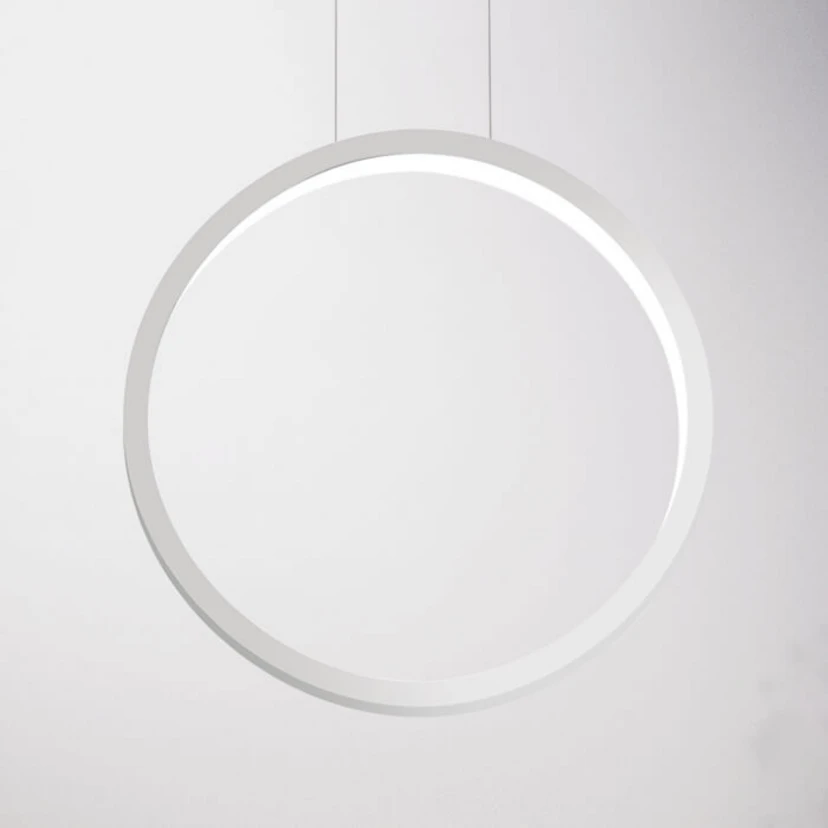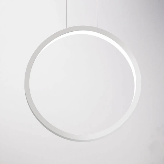 Suspension LED Assolo à l'éclairage diffus et sans éblouissement au design sophistiqué La suspension LED Assolo se révèle être un objet d'éclairage impressionnant dans la salle à manger, car la forme de l'abat-jour attire l'attention par sa forme annulaire inhabituelle. Cet élément en forme d'anneau en aluminium de haute qualité avec une peinture blanc neige est fixé à deux câbles métalliques discrets qui, grâce à leur aspect discret, donnent l'impression que le Ring flotte librement dans la pièce. Avec la technique d'éclairage LED intégrée tout autour de l'anneau, il en résulte non seulement un aspect fascinant, mais aussi une ambiance lumineuse extrêmement uniforme et sans éblouissement - Design by Cini&Nils Une plaque de plafond ronde est disponible en tant qu'accessoire, qui complète à merveille le design et recouvre idéalement les éventuels trous de perçage des luminaires précédents.