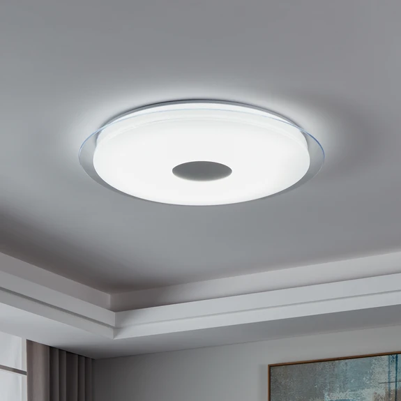 Avec effet cristal - Plafonnier LED Lanciano-Z, à commande smart Etincelant et fonctionnel - le plafonnier LED moderne Lanciano-Z offre une lumière polyvalente et fonctionnelle. Il se compose d'un diffuseur en plastique qui présente un léger effet cristal et crée ainsi une ambiance particulière. La couleur de lumière des LED intégrées peut varier du blanc chaud à la lumière du jour et est commandée par App, par commande vocale ou par une télécommande classique (voir accessoires). Grâce à la technologie utilisée, il est également possible d'intégrer le plafonnier LED Lanciano-Z dans des systèmes Smart-Home existants et compatibles d'autres fabricants qui utilisent ZigBee 3.0. Fonctions / compatibilité : - contrôlable avec l'App gratuite AwoX HomeControl - compatible avec les systèmes Smart-Home d'autres fabricants qui utilisent ZigBee 3.0 - connexion directe possible avec Amazon Echo et Google Home - portée accrue grâce à un Mesh Bluetooth supplémentaire - compatible avec tous les articles de la série EGLO connect-c Bluetooth - contrôlable avec une télécommande adaptée même sans accès à Internet (voir accessoires)