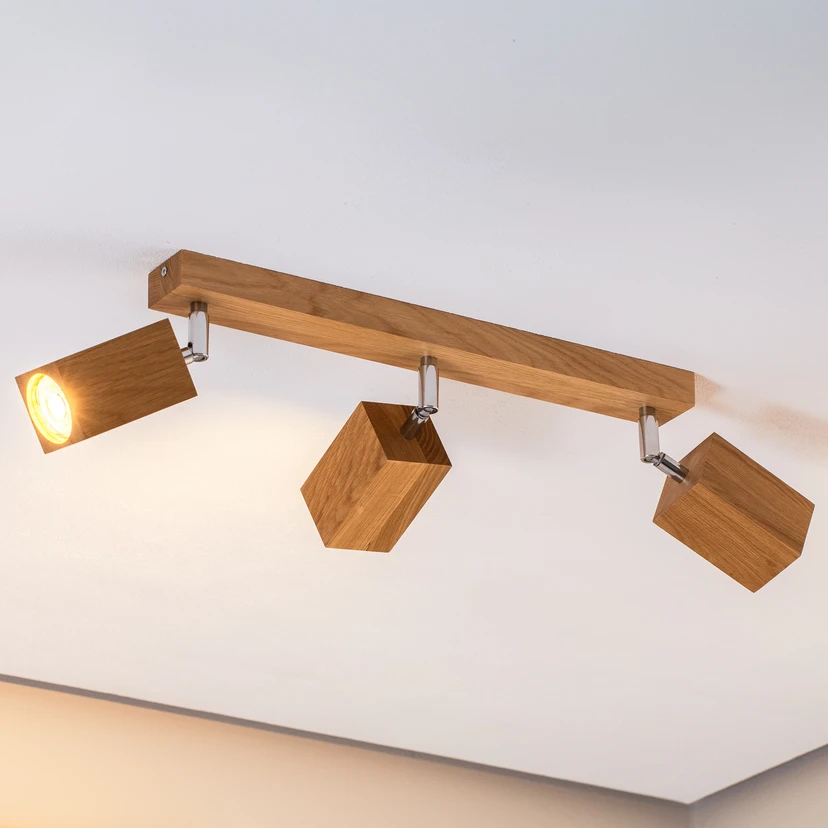 Spot de plafond à trois flammes Peach Puff en bois clair en forme de parallélépipède Le spot de plafond Peach Puff en bois, fabriqué en Europe, convainc en tant que diffuseur de lumière flexible et ajustable avec un rayonnement naturel pour l'intérieur sec. Les trois têtes en forme de parallélépipède sont placées sous un baldaquin rectangulaire et sont pourvues d'une ouverture ronde sur la face inférieure, adaptée à une ampoule de Ø 5 cm et de 5,6 cm de longueur.