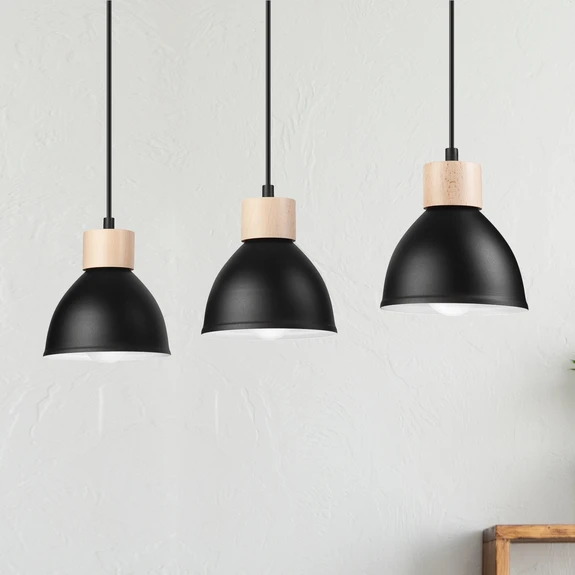 Suspension à 3 lampes Tira avec abat-jour rond noir et éléments en bois clair Décontractée, naturelle et avec une lumière diffusée directement vers le bas, la suspension Tira est l'accessoire parfait au-dessus d'une table ou d'un comptoir. Les trois abat-jours ronds ouverts en bas sont fabriqués en acier et sont suspendus en ligne sous le long rosace qui, comme le câble, est également de couleur noire. La suspension Tira doit son look caractéristique d'inspiration scandinave aux éléments en bois de hêtre clair placés sur les abat-jours - fabrication en Europe ; distances de transport raisonnables et émissions de CO2 réduites - bois certifié FSC® - emballage sans plastique avec matériaux recyclés
