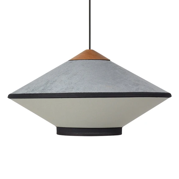 La suspension design Cymbal recouverte de velours crée un sentiment de bien-être La designer Jette Scheib cherche l'inspiration dans son environnement, dans les gens et dans leur comportement entre eux et avec les objets. Elle conçoit des luminaires qui ne sont pas seulement fonctionnels, mais qui créent avant tout une atmosphère de bien-être et qui ont de la personnalité. La suspension ronde Cymbal est une combinaison harmonieuse de textile et de bois qui remplit chaque pièce d'une lumière douce. L'abat-jour rond est caractéristique : il est divisé en deux parties et se termine en pointe au milieu, de sorte qu'il se divise en un côté supérieur et un côté inférieur. Cette division permet de séparer clairement les textiles, de sorte que la partie supérieure est recouverte de Samt et la partie inférieure de textile. Un petit abat-jour en bois forme la fin de l'abat-jour, d'où part le câble vers la fixation au plafond.