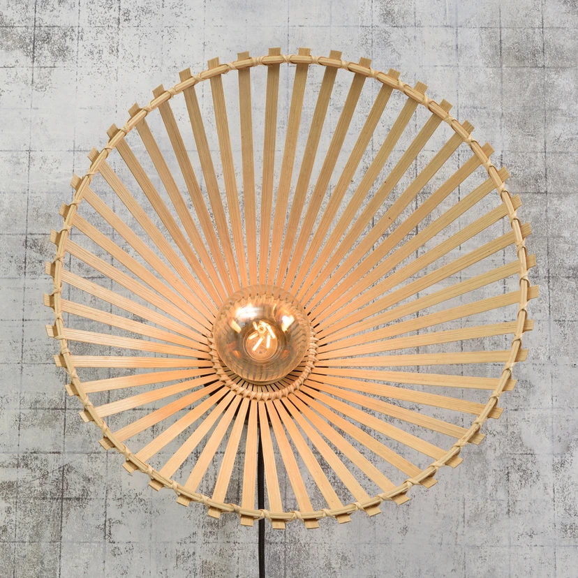 Applique murale asymétrique Bromo en bambou, avec interrupteur Un support mural rond et discret en fer constitue la Basis de l'applique murale Bromo. La douille y est intégrée et constitue le point central de cette lampe particulière. De ce point central partent de nombreuses fines entretoises en bambou clair, parallèles et régulières, vers un cercle extérieur qui forme le bord et donc la finition harmonieuse. L'ensemble de ces formes opposées forme un abat-jour rond et asymétrique, légèrement bombé en direction du mur, qui intègre et entoure l'ampoule à utiliser. Pour créer un effet lumineux particulier, il est conseillé de choisir une ampoule à tête miroir qui diffuse sa lumière principalement en direction du mur et brille ainsi à travers les espaces entre les entretoises, dessinant un motif d'ambiance sur le mur. L'aspect naturel de cette applique murale provient avant tout du matériau durable qu'est le bambou, dans lequel l'abat-jour est entièrement fabriqué. Le bambou est extrêmement solide et flexible et repousse en outre très rapidement après avoir été coupé. Des facteurs qui sont importants pour la marque Good & Mojo. Son assortiment se compose de luminaires durables et vit selon la devise : "Lorsque vous achetez de la lumière, vous en donnez" Cela se concrétise par une collaboration avec des fondations à but non lucratif comme la WakaWakaFoundation, qui fournit des produits solaires aux familles dans le besoin grâce à des dons. Ou encore par le partenariat avec Eden Reforestation Projects, qui permet de planter un arbre pour chaque lampe vendue.