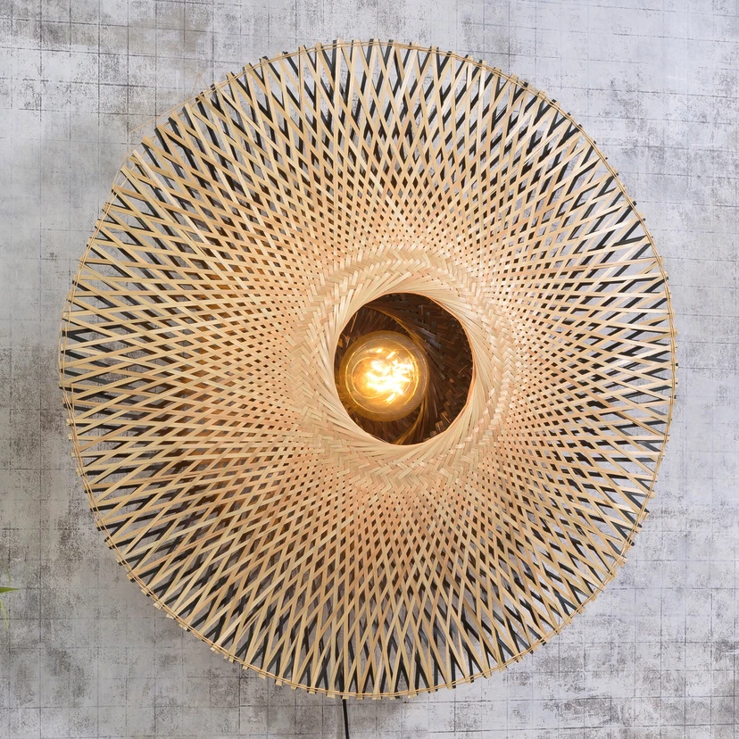 Applique murale ronde Kalimantan avec câble et interrupteur Cette applique murale ronde est un élément d'éclairage unique, fabriqué à partir de matériaux naturels qui conservent une coloration tout aussi naturelle. Kalimantan enthousiasme avec son abat-jour tressé en bambou flexible et stable, considéré comme un matériau durable. La plante peut toujours être coupée et repousse très rapidement, elle produit en outre beaucoup d'oxygène et enthousiasme par sa texture. Toutes les entretoises du motif convergent vers le centre du luminaire rond, où un évidement circulaire est aménagé. L'ampoule à insérer se trouve dans cette cavité, elle est entièrement visible et diffuse directement la lumière. Elle s'échappe en outre dans le corps du luminaire, où elle rayonne ensuite à travers les interstices et dessine une image lumineuse unique dans la pièce. Kalimantan est raccordé à l'aide d'un câble à fiche sur lequel est également intégré un interrupteur pour une utilisation sans effort. Good & Mojo est une marque de l'entreprise néerlandaise It's about Romi, qui a commencé à travailler avec des matériaux durables en 2010. Ce projet a donné naissance à sa propre marque durable, Good & Mojo, qui a été lancée en 2016. L'entreprise s'engage également dans des projets sociaux et fait la promotion du fait que pour chaque produit vendu, un arbre est planté.