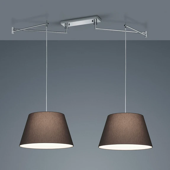 La tige et le baldaquin du luminaire suspendu flexible sont en métal chromé, ce qui donne au luminaire un aspect glamour et moderne. Les abat-jour de forme conique sont fabriqués en tissu de chintz. Ils permettent à la lumière de briller directement vers le bas et aussi vers le haut sous un grand angle, tandis que la lumière est atténuée tout autour et pénètre doucement dans la toile d'ombrage.