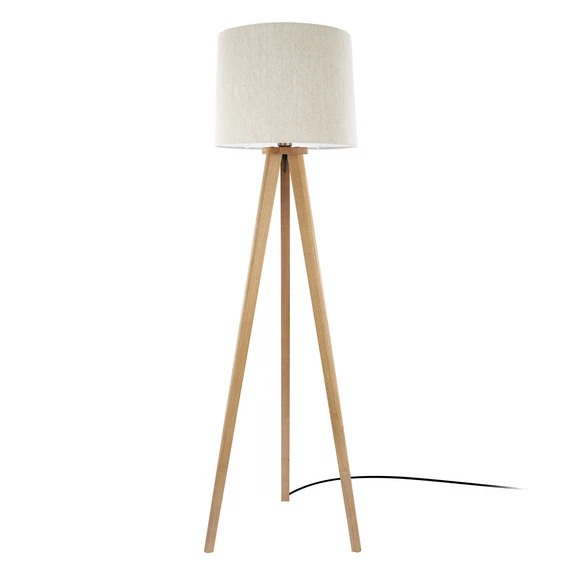 Lampadaire tripode Elli avec structure en bois et abat-jour en tissuAvec sa combinaison caractéristique de matériaux en bois, textile et métal et sa forme intemporelle, le lampadaire Elli est un diffuseur de lumière polyvalent et confortable pour l'intérieur. L'ampoule à utiliser est placée dans une douille en nickel brossé mat. L'abat-jour ouvert verticalement en forme de cône tronqué diffuse la lumière vers le haut et vers le bas ainsi qu'en douceur tout autour. Le piètement tripode en bois séduit par un détail élégant : le câble ne passe pas ouvertement entre la douille et le sol, mais est guidé par un canal dans l'un des pieds - bois issu de forêts gérées durablement et provenant de fournisseurs certifiés FSC - fabrication en Allemagne
