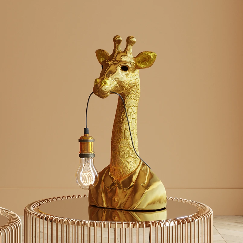 Lampe de table Animal Giraffe - une lampe à tabouret majestueuseAnimal Giraffe est une grande lampe de table de Kare, fabriquée en polyrésine avec un vernis doré et qui peut très bien être placée sur un tabouret grâce à sa taille. La majestueuse girafe tient dans sa gueule un câble noir au bout duquel se trouve l'ampoule dans une douille E27 joliment décorée en aluminium cuivré. Pour que le look soit parfait, il convient d'utiliser comme source lumineuse une lampe à filament LED au design rétro.