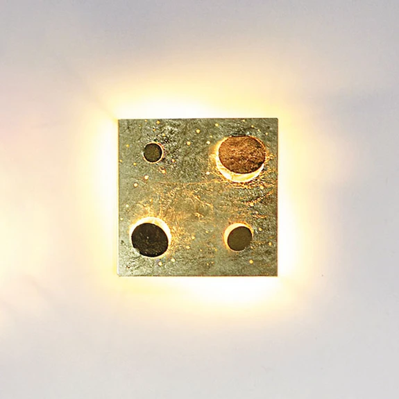 Plafonnier et applique carrés Buchi avec finition dorée - inspirés par le ciel étoiléCette lampe compacte peut être installée sans problème aussi bien au plafond qu'au mur. La lampe Buchi diffuse une lumière non éblouissante et met en même temps des accents décoratifs du plus bel effet. Son design a été inspiré par le miracle du ciel nocturne étoilé, qui fascine les hommes depuis toujours. Une particularité du plafonnier et de l'applique Buchi : chaque exemplaire est fabriqué à la main et se distingue des autres lampes par de nombreux détails raffinés. La finition dorée du luminaire Buchi, fabriqué en tôle d'acier résistante, lui confère un aspect luxueux. Cette source de lumière originale est donc le bon choix pour créer un concept d'espace sophistiqué et élégant. Mais les îlots de vie confortables dans un loft ou une maison aménagée de manière moderne et tendance profitent aussi clairement du plafonnier et de l'applique Buchi.