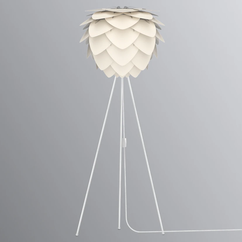 L’abat-jour original avec sa structure florale constituée d'éléments en forme de feuilles contraste avec la sobriété du trépied. La lampe Aluvia est fournie avec un câble d’alimentation de 300 cm qui part du dessous de la douille et qui fait donc partie du design de la lampe.