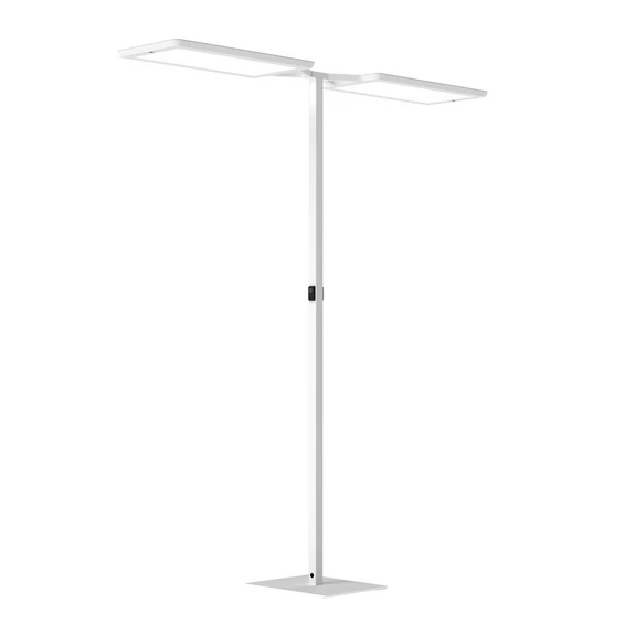 Lampadaire de bureau LED Yara.double avec deux sources lumineuses contrôlables séparément et couleur de lumière réglable Le lampadaire LED Yara.double est destiné à l'éclairage direct d'un poste de travail double et produit également un éclairage de base. Les deux panneaux peuvent être commandés indépendamment l'un de l'autre. Le luminaire au design clair et moderne dispose de fonctions pratiques. La sortie de lumière peut être réglée, la couleur de lumière peut être ajustée du blanc chaud à la lumière du jour, le capteur PIR détecte les mouvements et la luminosité ambiante. Grâce au module TALK Bluetooth intégré, l'intégration dans l'App Light Admin est une réussite. Celle-ci permet d'affecter tous les luminaires d'un bâtiment à des zones spécifiques ou à des groupes. Dès qu'un capteur détecte une présence, ce signal est transmis aux luminaires environnants afin d'harmoniser l'éclairage de tous les spécimens (commande par essaim). Grâce à l'App Light User, les différents utilisateurs peuvent commander les luminaires directement depuis leur poste de travail ; cela peut en outre se faire via l'élément de commande magnétique et coulissant sur le STAND. La technologie VTL offre une autre valeur ajoutée. Grâce à elle, Yara.double règle l'éclairage en fonction du déroulement de la journée et de la luminosité ambiante afin de respecter le biorythme humain - valeur UGR <= 10 - ballast électronique (DALI) - capteur de mouvement PIR et de lumière du jour - commande par App ; TALK Bluetooth (commande par essaim) - pied rectangulaire - rayonnement asymétrique - sans scintillement - éléments de commande magnétiques - VTL - lumière biodynamique