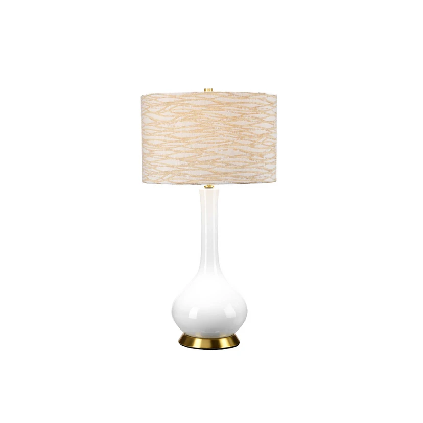 Lampe à poser Milo avec pied en céramique et abat-jour en tissu La lampe à poser Milo apporte une touche colorée à la pièce. Son pied est en céramique blanche brillante avec un anneau métallique décoratif à l'extrémité inférieure, l'abat-jour en forme de cylindre est en tissu avec une belle structure et des motifs. La lampe s'allume et s'éteint grâce à l'interrupteur intégré dans le câble