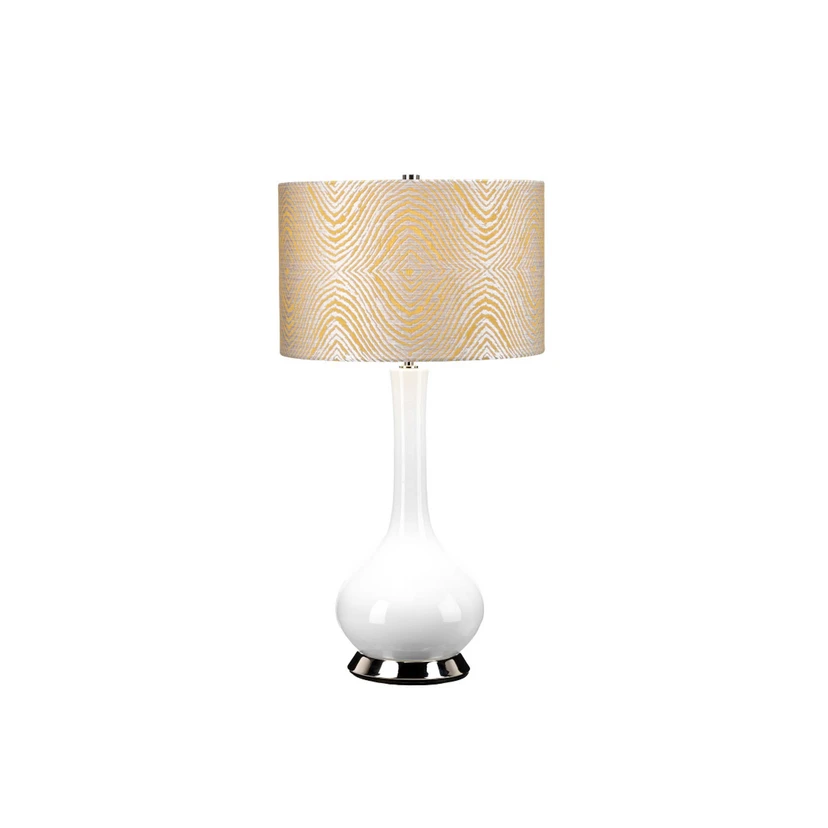 Lampe à poser Milo avec pied en céramique et abat-jour en tissu La lampe à poser Milo apporte une touche colorée à la pièce. Son pied est en céramique blanche brillante avec un anneau métallique décoratif à l'extrémité inférieure, l'abat-jour en forme de cylindre est en tissu avec une belle structure et des motifs. La lampe s'allume et s'éteint grâce à l'interrupteur intégré dans le câble