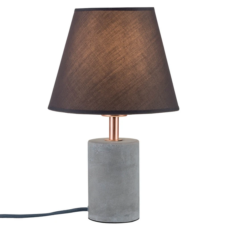Cette lampe à poser est ornée d'un abat-jour textile de forme classique et de couleur noire et dispose d'un pied cylindrique original en béton et d'un support d'abat-jour cuivré sur le dessus. Cela donne un look très particulier à la lampe qui attire donc tous les regards. La lumière est légèrement tamisée par l'abat-jour en textile noir ce qui assure un éclairage sans éblouissement.