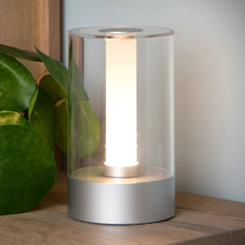 Lampe à table LED rechargeable Tribun avec variateur d'intensité à 3 niveaux Dans toute la maison, la lampe à table LED Tribun peut être utilisée comme source de lumière supplémentaire, car elle fonctionne avec un accumulateur et n'a donc besoin d'une prise de courant que pour être rechargée. Le luminaire de forme cylindrique en polymère et acrylique est équipé de LED blanc chaud dans le diffuseur satiné placé au centre de l'abat-jour. La lampe à poser avec fonction tactile s'allume et s'éteint d'un simple effleurement et offre trois niveaux de luminosité. Un câble de charge USB pour le chargement sur une prise de courant est fourni. Lorsque les batteries sont entièrement chargées, la durée d'éclairage peut atteindre 8 heures avec une luminosité maximale.