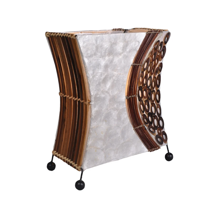 Lampe de table Wayan fabriquée à la main à Bali La petite lampe de table Wayan séduit par son atmosphère exotique, due avant tout aux matériaux naturels utilisés. La lampe, composée de disques de coquillages blancs et d'un décor en bambou sous forme d'anneaux et de bandes, est fabriquée à la main à Bali et diffuse une douce lumière supplémentaire. La livraison comprend 2 m de câble d'alimentation et un interrupteur.