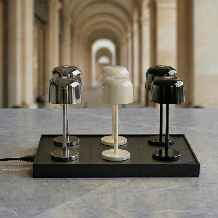 La station de charge pour lampe de table rechargeable Quill, d'un noir élégant, offre une solution rapide et élégante pour recharger jusqu'à six lampes simultanément. Fabriquée en polycarbonate de haute qualité, cette station de charge promet non seulement une longue durée de vie, mais aussi un design attrayant.