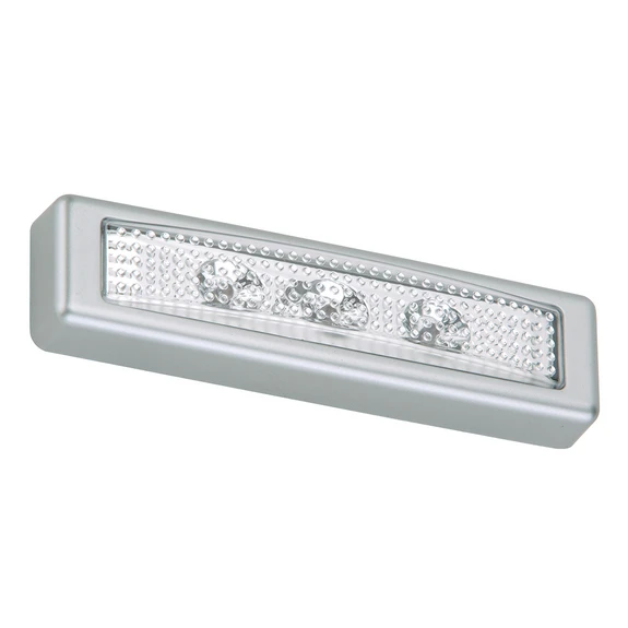 Une fonctionnalité simple : LED Push-Light Pusi avec piles et patch adhésif La LED Push-Light Pusi à 3 lampes convainc par ses nombreuses caractéristiques utiles. Son utilisation est un jeu d'enfant et se fait par simple pression sur la lampe, ce qui permet d'allumer et d'éteindre la lumière. Le design du luminaire LED Pusi est simple et donc extrêmement variable en ce qui concerne les possibilités d'utilisation. Le luminaire est principalement composé de plastique de couleur titane. Il est livré avec des LED intégrées et une pile adaptée. Pour l'installer, il suffit de presser le luminaire sur la surface lisse choisie à l'aide du tampon adhésif situé à l'arrière. La lumière a un angle de rayonnement de 120° et éclaire l'environnement proche.