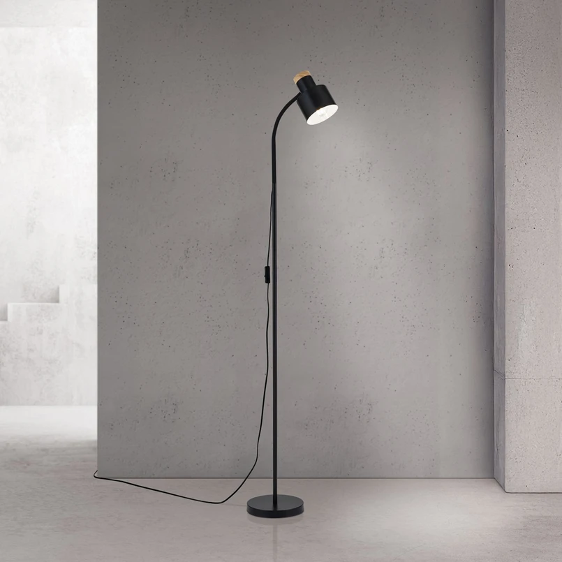Lampe sur pied Gili avec partie flexible et décor bois sur l'abat-jour