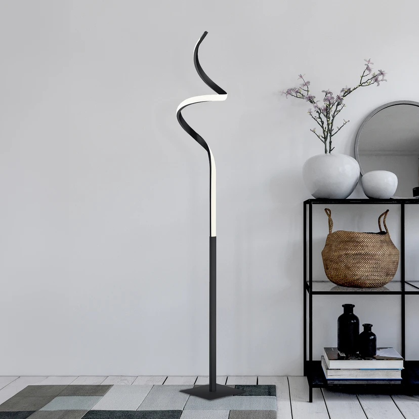 Lampe sur pied LED Course au look futuriste - avec variateur à détecteur Avec son design composé d'un long profilé métallique qui se courbe sur lui-même, le lampadaire LED Course s'harmonise parfaitement avec les intérieurs modernes. Des LED sont intégrées sur toute la longueur du profilé et diffusent une lumière blanche chaude de tous les côtés. L'intensité lumineuse peut être variée en continu grâce à un variateur d'intensité intégré.
