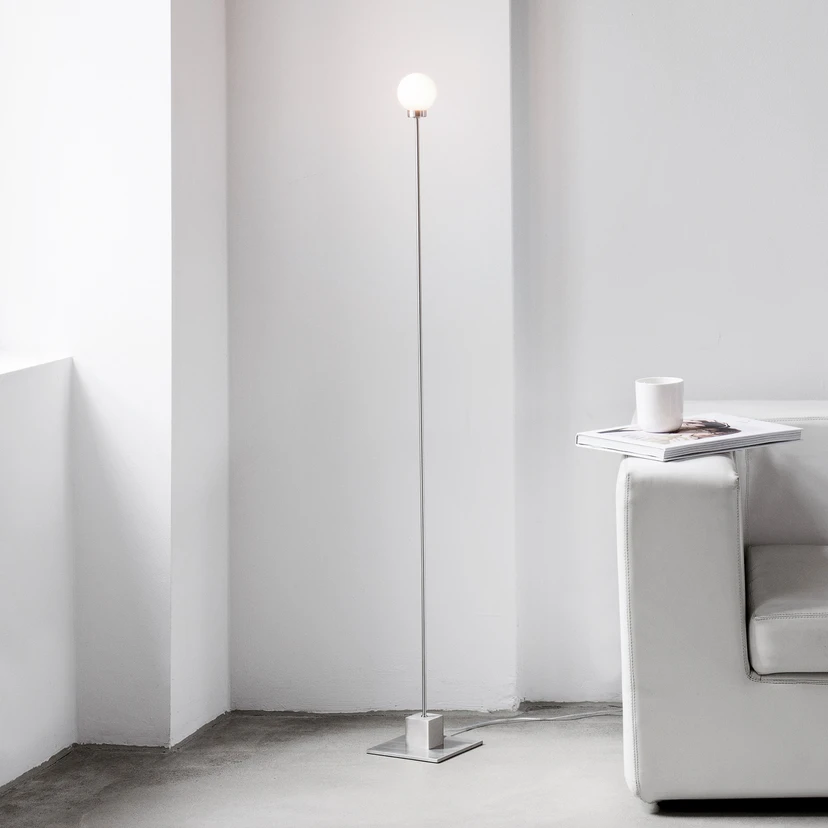 Une tige métallique plutôt filigrane s'élève d'un socle rectangulaire et soutient à son extrémité supérieure l'abat-jour sphérique en verre dépoli. Celui-ci veille à ce que la lumière soit diffusée de manière douce et homogène dans la pièce et crée une atmosphère agréable. Le verre de l'abat-jour est soufflé à la bouche et témoigne d'une fabrication de haute qualité. De plus, un variateur d'intensité intégré, fixé au câble d'alimentation, permet de régler facilement l'intensité lumineuse.