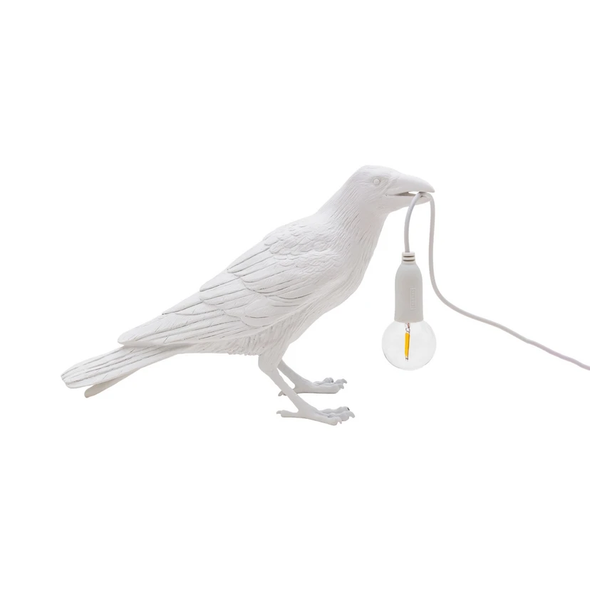 Lampe de table LED décorative Bird Lamp, oiseau dans une pose d'attente Placée sur une table, un rebord de fenêtre ou une table d'appoint, Bird Lamp est un objet de décoration lumineux pour l'intérieur. La figure d'oiseau en résine synthétique prend une position d'attente et tient avec son bec un câble qui débouche dans une douille E14 avec une lampe à filament LED basse tension