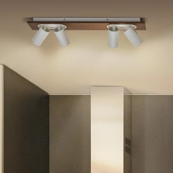 Spot pour plafond LED Mercury, à 4 lampes avec ampoules LED GU10 Grâce à sa belle combinaison de matériaux et de couleurs et à son design sobre, le spot pour plafond LED Mercury à 4 lampes attire l'attention. Le long rosace rectangulaire, qui, comme les quatre spots, est en acier laqué, est surmonté d'une plaque décorative en bois foncé légèrement plus grande. Sur celle-ci, les spots sont posés par paire dans des ovales en acier. Le réglage de chaque spot permet d'éclairer de manière ciblée différentes zones de la pièce. Ampoules LED GU10 à intensité variable fournies et remplaçables - Accessoires de montage et de raccordement complets inclus