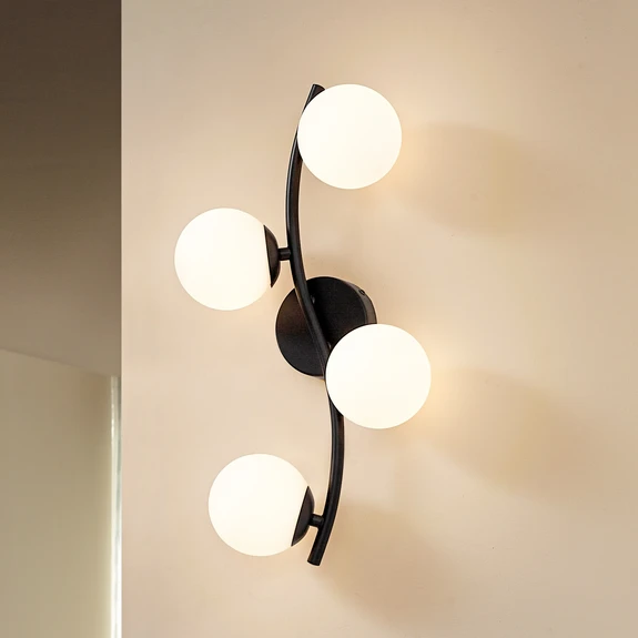 L'applique murale Josiana associe le verre opale à une élégante finition noire et s'intègre parfaitement dans les salons et salles à manger modernes. Le jeu entre le verre et le métal confère à cette lampe une esthétique intemporelle qui impressionne aussi bien dans les intérieurs minimalistes que dans les styles d'ameublement plus sophistiqués. Les couleurs harmonieuses, blanc et noir, créent une atmosphère élégante et soulignent la polyvalence de cette lampe.
