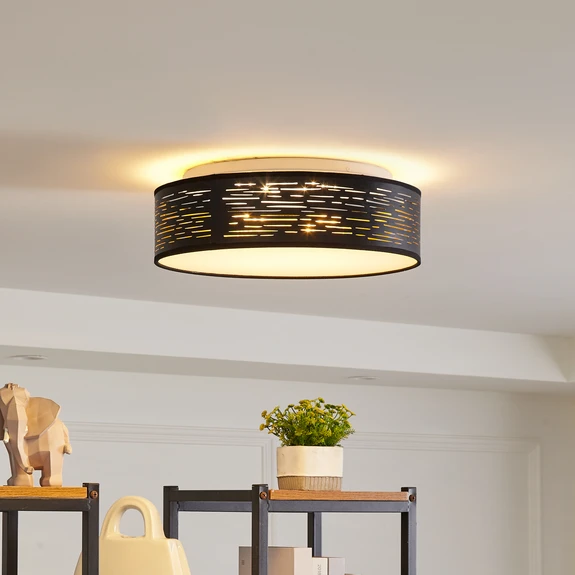 Plafonnier moderne Iolyn Le plafonnier moderne Iolyn est un luminaire rond qui se monte directement au plafond. L'extérieur est noir et l'abat-jour est percé de petites ouvertures. Celles-ci laissent entrevoir l'intérieur doré et créent un effet magique lorsque la lumière s'allume. À travers l'écran inférieur, la lumière est diffusée en douceur dans la pièce. Le plafonnier Iolyn est ainsi parfaitement adapté à la chambre à coucher par exemple.