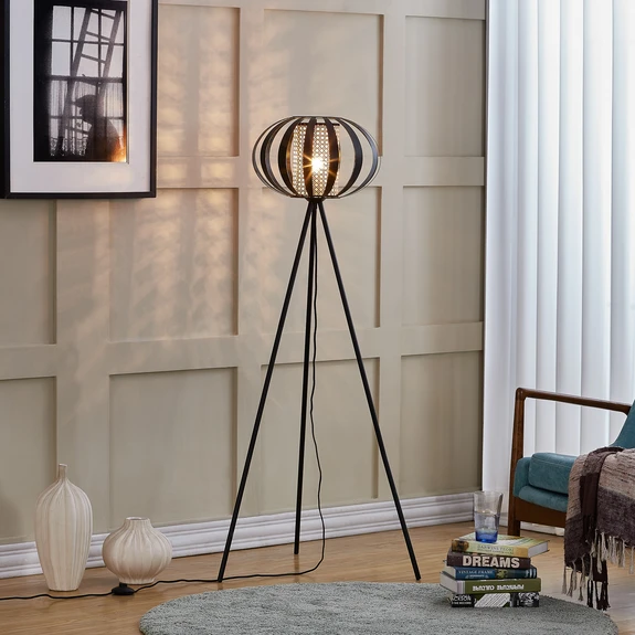 Lampe sur pied Tamira en métal et rotin - le trépied rustique pour l'intérieur Cette lampe de sol apporte des accents lumineux décoratifs dans votre intérieur. La lampe est très facile à utiliser grâce à un interrupteur sur son câble. Il présente un joli style et s'intègre parfaitement dans n'importe quel espace. Ce magnifique lampadaire au design intemporel confère à votre intérieur une atmosphère agréable. Le lampadaire est équipé d'une douille E27. Il est de couleur noire et bois. Avec ce lampadaire, faites le choix de l'excellence de la marque Lindby. Votre intérieur sera enrichi par ce lampadaire qui a rapidement trouvé sa place. Assurez un éclairage parfait dans vos quatre murs avec ce luminaire.