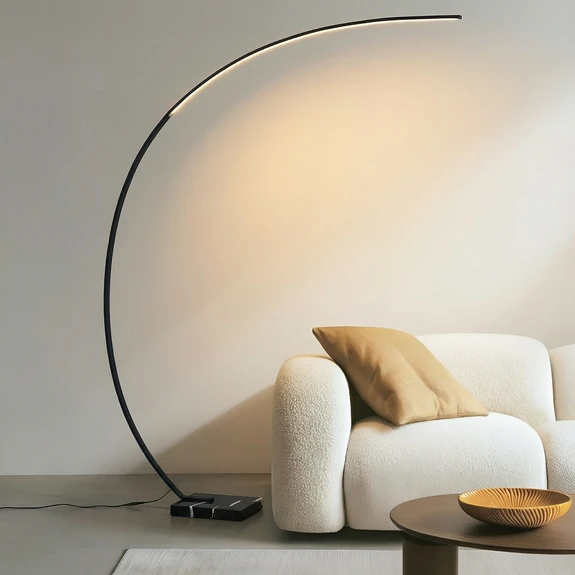 Lampe sur pied LED courbe Kendra avec surface noire et aspect minimaliste, variateur d'intensité variable intégré ? Kendra s'intègre parfaitement dans les espaces modernes grâce à son design minimaliste et répond également aux normes techniques les plus récentes, car elle est alimentée par la technologie LED à haute efficacité énergétique. De plus, un variateur d'intensité au pied est intégré, ce qui permet de régler la luminosité avec précision. La forme en arc fait de la lampe sur pied Kendra un diffuseur de lumière qui peut être placé à côté ou derrière un canapé, car le pied peut alors être placé plus en arrière, mais la lumière atteint tout de même un endroit présent. Le pied de la lampe est en marbre lourd et ne risque pas de se renverser, ce qui garantit un maintien solide et sûr. ?